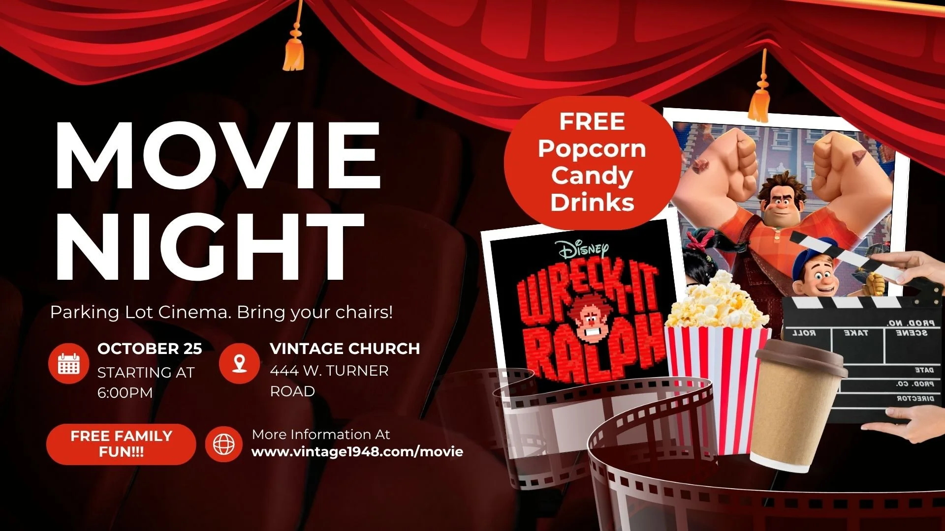 Bring the family on October 25 to watch “Wreck-it Ralph” at 6:00pm. We’ll provide the popcorn, candy and drinks. You bring your own lawn chairs or blanket. The movie will start at sunset (6:30ish). Before the movie, we’ll have a costume contest for kids (0-18) and some raffle prizes.